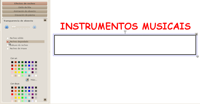 Mentres tés seleccionada a forma, preme sobre a pestana de propiedades na barra esquerda e escolle Recheo degradado. Elixe unha cor para a cor un e outra para a cor dous. Ao mesmo tempo que fas isto, a forma vaise coloreando tal e como ti o decidiches.