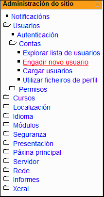 Para engadir un usuario á plataforma temos que acceder como administradores e desde a xanela de adminstración na parte esquerda prememos en Usuarios>Contas>Engadir novo usuario.
