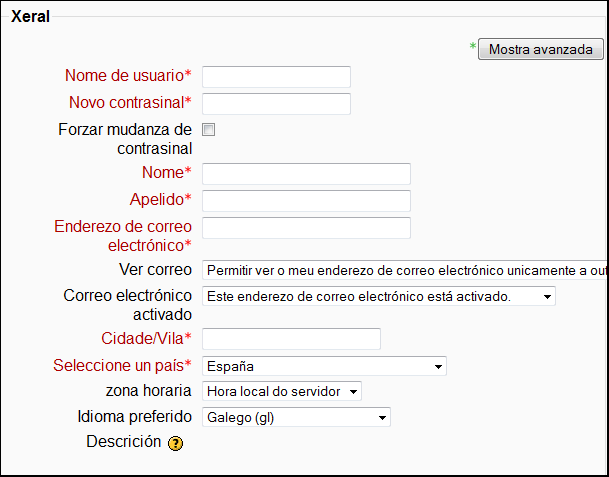 A continuación cubrimos os campos cos datos do novo usuario. Debemos marcar a casiña Forzar mudanza de contrasinal para que os usuarios teñan a obriga de poñer un contrasinal novo para o seu perfil unha vez que entren por primeira vez.