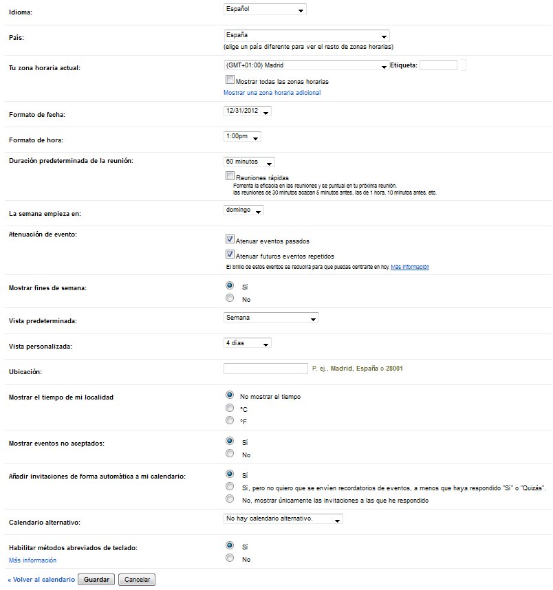 Podemos variar o idioma, país, zona horaria (configurada en principio no primeiro acceso), formato de fecha, formato de hora, a duración predeterminada cando creamos un evento rápido, o día no que comeza a semana, se os eventos xa pasados se atenúan na visión da axenda, o mesmo cos futuros repetidos, se queremos que as fins de semana formen parte da axenda ou non, a vista predeterminada para cando abrimos a axenda, a vista personalizada, a nosa situación xeográfica (voluntario), se queremos información complementaria sobre a situación meteorolóxica (precisa establecer a situación xeográfica), se queremos amosar os eventos rexeitados doutros e se permitimos invitacións de usuarios/as (formación avanzada), calendarios alternativos que podemos engadir (por exemplo o de festas oficiais) e finalmente se queremos habilitar métodos abreviados de teclado (do mesmo xeito que no procesador de texto existen combinacións do teclado para actuar máis rapidamente sobre a axenda; podemos ver un cadro premendo no texto más información debaixo desta opción).