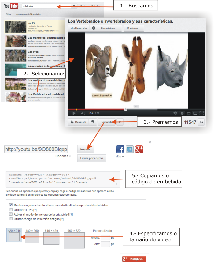 1.- Obteña o "código de embebido". Vaia a youtube (ou a calquera outra que nos permita obter este código) e "localice" o vídeo.