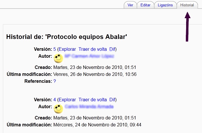 Historial: rexistro dos cambios da páxina. Unha das vantaxes das wikis é que permiten desfacer os cambios e retornar o contido a un momento ( revisión) concreto (coa opción "Traer de volta" )