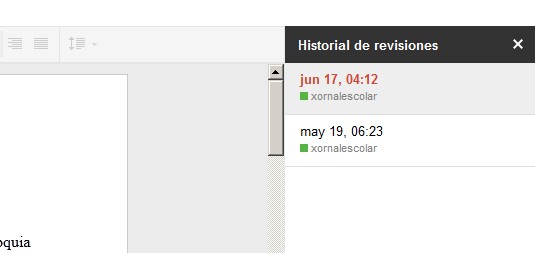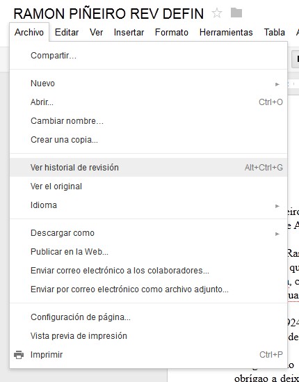 Google garda un histórico coas modificacións dos documentos. Para acceder ao historial escolle "Ver historial de revisión" no menú "Archivo".