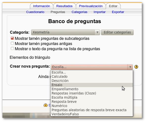 Así temos xa case todo configurado. Só falta confeccionar as preguntas do noso cuestionario para engadilas despois. Dentro da mesma xanela, no menú superior, accedemos ao banco de preguntas premendo na pestana Preguntas. Seleccionamos a Categoría previamente creada e, en Crear nova pregunta, seleccionamos no menú Escolla o tipo de pregunta que corresponda.