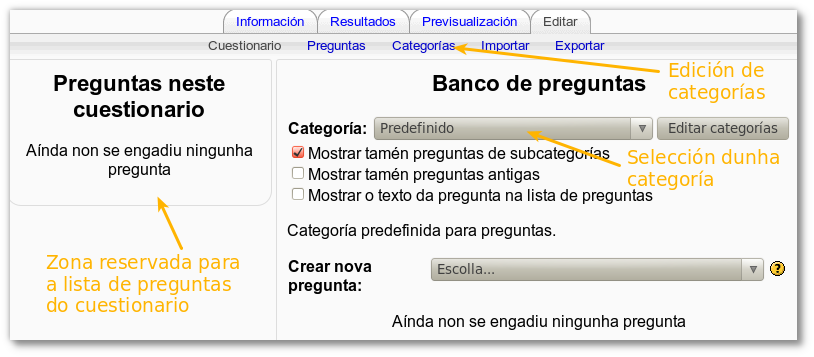 Nesta páxina aparecen dúas seccións. A zona da esquerda amosa unha listaxe coas preguntas do cuestionario (inicialmente esta lista estará baleira). Á dereita aparece o banco de preguntas, organizado por categorías. Dende este banco podemos copiar preguntas a un cuestionario calquera, independentemente do curso no que apareza.