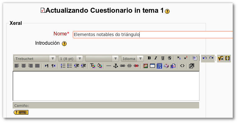 O corpo do cuestionario é o primeiro que ven os estudantes cando acceden á actividade e define como interactuarán con ela. Para crear o corpo dun cuestionario, hai que activar o modo de edición e, a continuación, seleccionar Cuestionario da lista despregable Engadir unha actividade. Isto levaranos ao seu formulario de configuración, onde completaremos os seguintes campos :