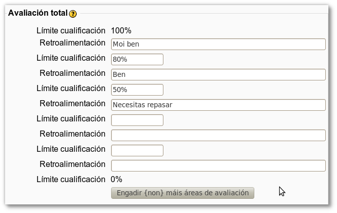 De todas as maneiras, é interesante saber que nesta sección podemos introducir un texto (retroalimentación) que verá o estudante cando complete un intento de resolver o cuestionario. O texto pode depender da cualificación que o estudante consiga. Por exemplo, para as respostas e os límites de cualificación mostrados na figura seguinte, os estudantes que puntúen 80% ou máis verán a mensaxe “Moi ben”, os que consigan máis do 50% pero menos do 80% verán “Ben”, en tanto que os que teñan unha puntuación menor do 50% verán “Necesitas repasar”.