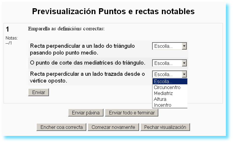 A cualificación da pregunta é automática en función do número de parellas correctas que se formen. Se son todas, outórgase o 100% do valor da pregunta; se é só a metade das posibles, o 50%... Estas preguntas valoran principalmente o recoñecemento, pero poden utilizarse para sondar a comprensión mediante asociacións non tan obvias. O sistema cualificará automaticamente calquera combinación que se elixa.