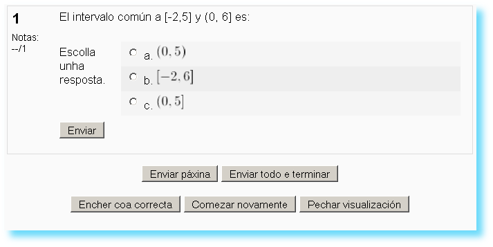 b) Preguntas de resposta múltiple. As preguntas de resposta múltiple permiten escoller unha ou varias respostas por medio dunha casa de verificación. Cada resposta pode ter unha puntuación positiva ou negativa, de tal forma que se se marcan todas as opcións non se obteña necesariamente unha boa cualificación. Se a puntuación total é negativa, a cualificación total desa pregunta será cero.