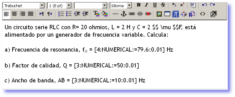 Exemplo 3: Encher cadros baleiros con respostas numéricas indicando a marxe de tolerancia. No lugar onde queiramos que apareza o oco ou cadro baleiro inseriremos o código encerrado entre chaves. Como nos exemplos anteriores, o código consta de varios campos separados por dous puntos (:). O primeiro campo indica cantos puntos valerá a pregunta. O segundo contén a palabra NUMERICAL (escrita en maiúsculas). O terceiro, precedido polo signo igual (=), contén a resposta numérica correcta. O último campo é opcional e permítenos indicar unha marxe de tolerancia. Por exemplo, se queremos especificar unha marxe de tolerancia de ±0.04, debemos escribir devandito valor no último campo (sen o símbolo ±). Podemos especificar varias respostas correctas separadas por un til(~) seguido polo signo igual, é dicir, ~=resposta.