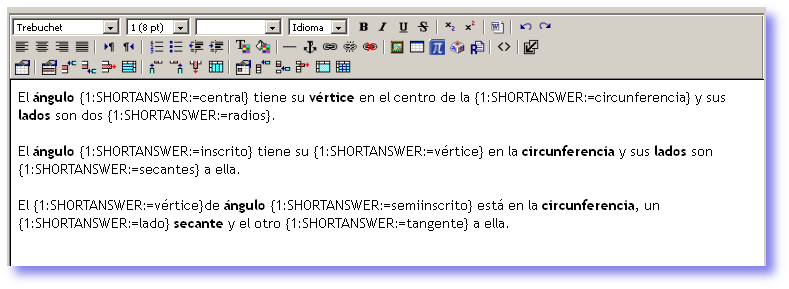 Como no exemplo anterior, o código consta de tres campos separados por dous puntos (:). O primeiro campo indica cantos puntos valerá a pregunta. O segundo contén a palabra SHORTANSWER (escrita en maiúsculas). E o terceiro, precedido polo signo igual (=), contén a resposta correcta. Podemos especificar varias respostas correctas separadas por un til(~) seguido polo signo igual, é dicir, ~=resposta.