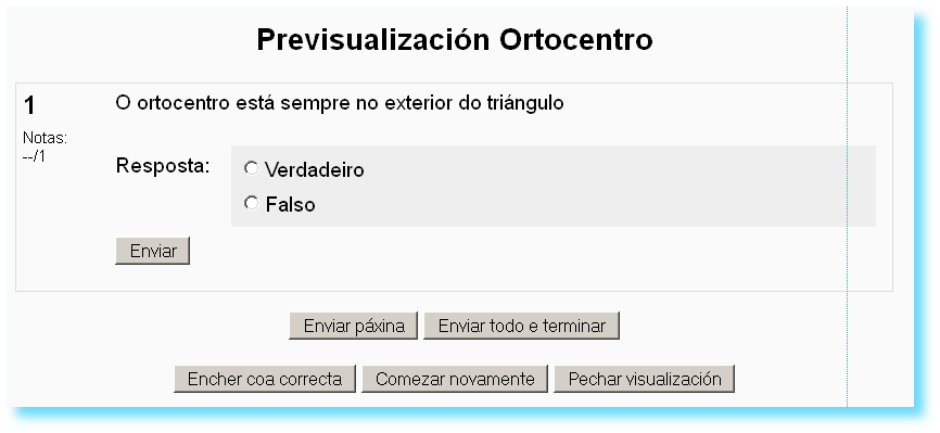 Verdadeiro/Falso. Este tipo de pregunta ten só dúas opcións de resposta mutuamente excluíntes. A resposta correcta é cualificada automaticamente co 100% da cualificación. Ambas opcións poden ter unha retroalimentación ou texto de reforzo.