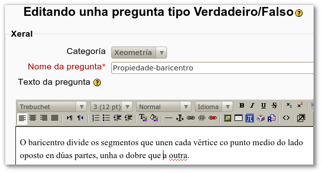 Insistimos en que o nome da pregunta non é visible para os estudantes. Só os/as profesores/as teñen acceso ás preguntas, o nome serviranos para identificar o seu contido e clasificalas dentro do banco.