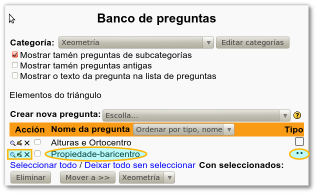 Unha vez que gardemos as modificacións, esta cuestión aparecerá automaticamente no banco de preguntas. Dende aquí podemos previsualizala, editala de novo ou eliminala premendo na acción adecuada.