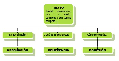 En esta primera unidad y en las siguientes, para organizar y recordar la información que te exponemos, vamos a emplear esquemas y mapas conceptuales que, sin duda, te ayudarán en la producción de tus propios textos. A continuación, te exponemos un mapa conceptual que recoge todo lo relativo a las características de un texto y que acabamos de indicar: