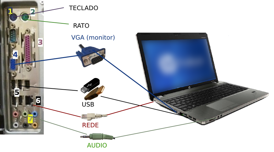 - Os portátiles adoitan ter as conexións nos laterais e na parte traseira. Na parte dianteira teñen, polo xeral, as conexións de audio (altofalantes ou auriculares e microfóno).