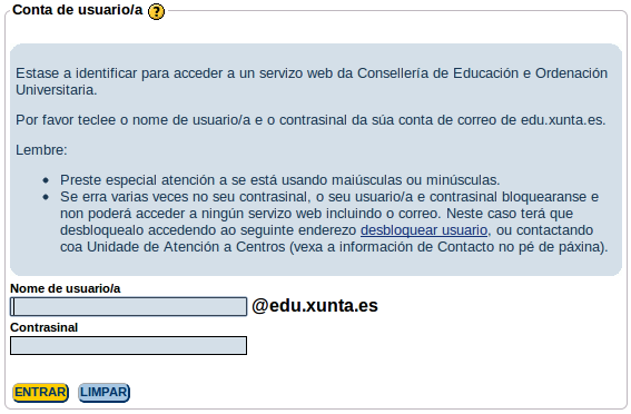 Para utilizar a nosa conta deberemos introducir só o nome de usuario (o que vai á esquerda de @edu.xunta.es;); escribir o contrasinal, tendo en conta que non vemos o que escribimos senón uns puntos; procedemento estándar que ten a finalidade de protexer o contrasinal de miradas alleas, e prememos "Entrar".