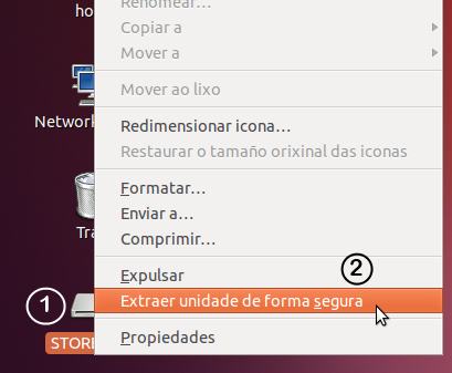 - O mesmo proceso en Linux consíguese facendo clic co botón dereito do rato sobre a icona do Pen Drive e seleccionando "Extraer unidad de forma segura". Poderemos desenchufalo en canto a icona desapareza do escritorio.