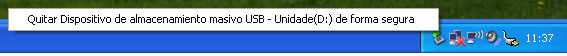 - O último paso consiste en facer clic na icona cunha frechiña verde que aparece na área de notificación de Windows (abaixo e á dereita na nosa pantalla) e seleccionar "Quitar Dispositivo..."; seleccionamos o dispositivo a retirar e esperamos pola mensaxe "É seguro eliminar o hardware", tal e como se amosa na secuencia de imaxes inferior.