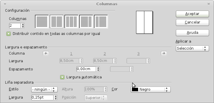 Fai clic nesta ligazón. O buscador te levará a unha páxina dende a que podes descargar un texto indicando o número de parágrafos que queres. Pon os que queiras e preme no botón "Generar" . Unha vez xerado o texto, selecciónao e despois preme o botón dereito do rato e no menú elixe "Copiar". Abre o procesador de texto e clic co botón dereito. Elixe "Pegar". Agora selecciona un parágrafo e vai ao menú "Formato" > "Columnas". Selecciona o número de columnas que queres e o espazamento entre elas. Clic en "Aceptar"