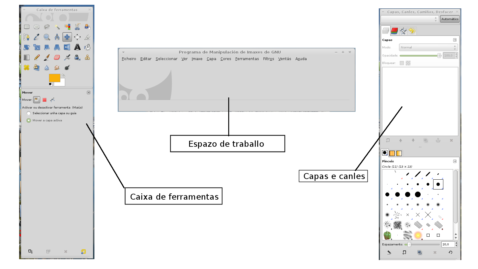 Como podemos observar, a interface de usuario está dividida en tres partes: A esquerda a caixa de ferramentas, que veremos un poquiño máis adiante; no medio estará a imaxe na que traballemos en cada momento, e á dereita, hai unha caixa mediante a que podemos manipular (crear, ordear, eliminar...) capas e canles.