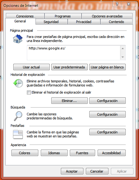 - Vai ao menú "Herramientas" > "Opciones de internet" > Pestana "General" elimina o historial ou garda unha configuración diferente.