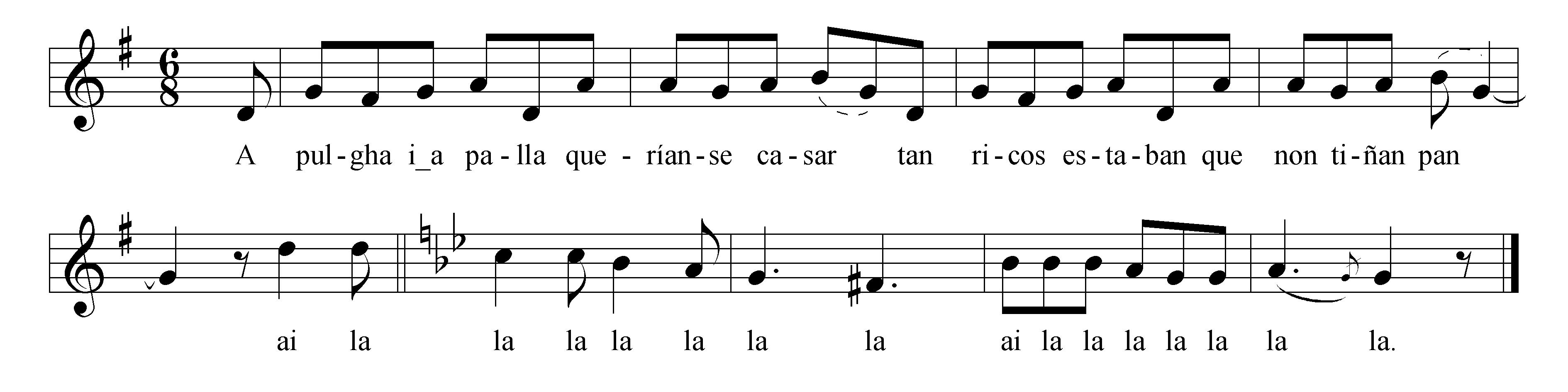 A pulgha i a palla queríanse casar tan ricos estaban que non tiñan pan. Saíu a formiga do seu formigheiro, que sighan ar bodas qu’eu son panadeiro. I ahora mi vida panciño tenemos, fáltanos el vino, ¿iónde lo hallaremos? Salíu o mosquito do seu mosquiteiro que sighan ar bodas qu’eu son taberneiro. I ahora mi vida, viniño tenemos, fáltanor la carne, ¿iónde la hallaremos? Salíu o lobo detrás do valado si fai falta carne mandarme recado. I ahora mi vida, carniña tenemos, fálta la madriña, ¿iónde la hallaremos? Salíu a raniña da súa pociña que sighan as bodas qu’eu vou de madriña. |