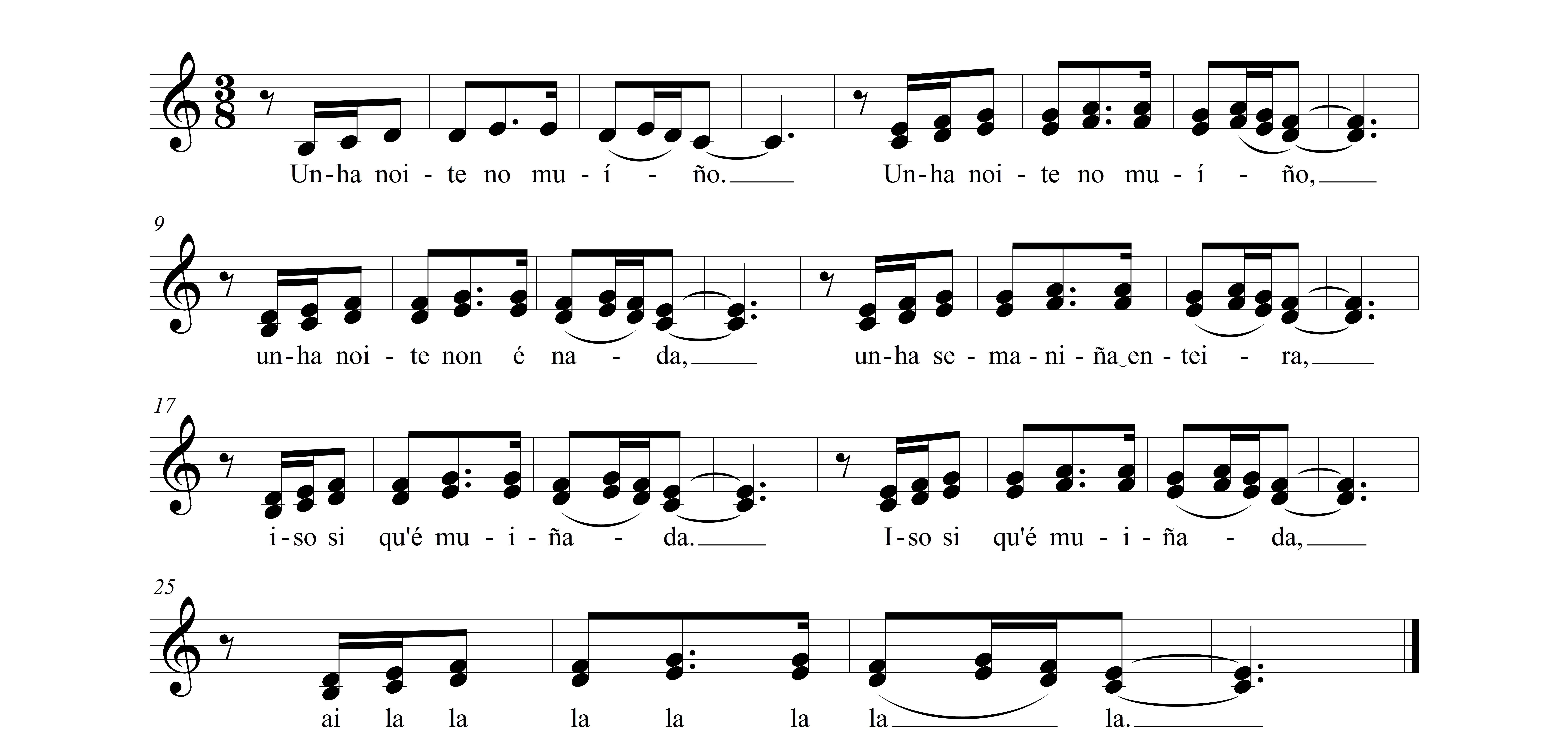 Unha noite no muíño, (bis) unha noite non é nada, unha semaniña enteira iso si que é muiñada. San Gonzalo de Amarante, (bis) casamenteiro das vellas. Por qué non casa-las novas? Que mal che fixeron elas? Heiche de toca-las cunchas, (bis) miña carrapucheiriña. Heiche de toca-las cunchas, naquela corredoiriña. |