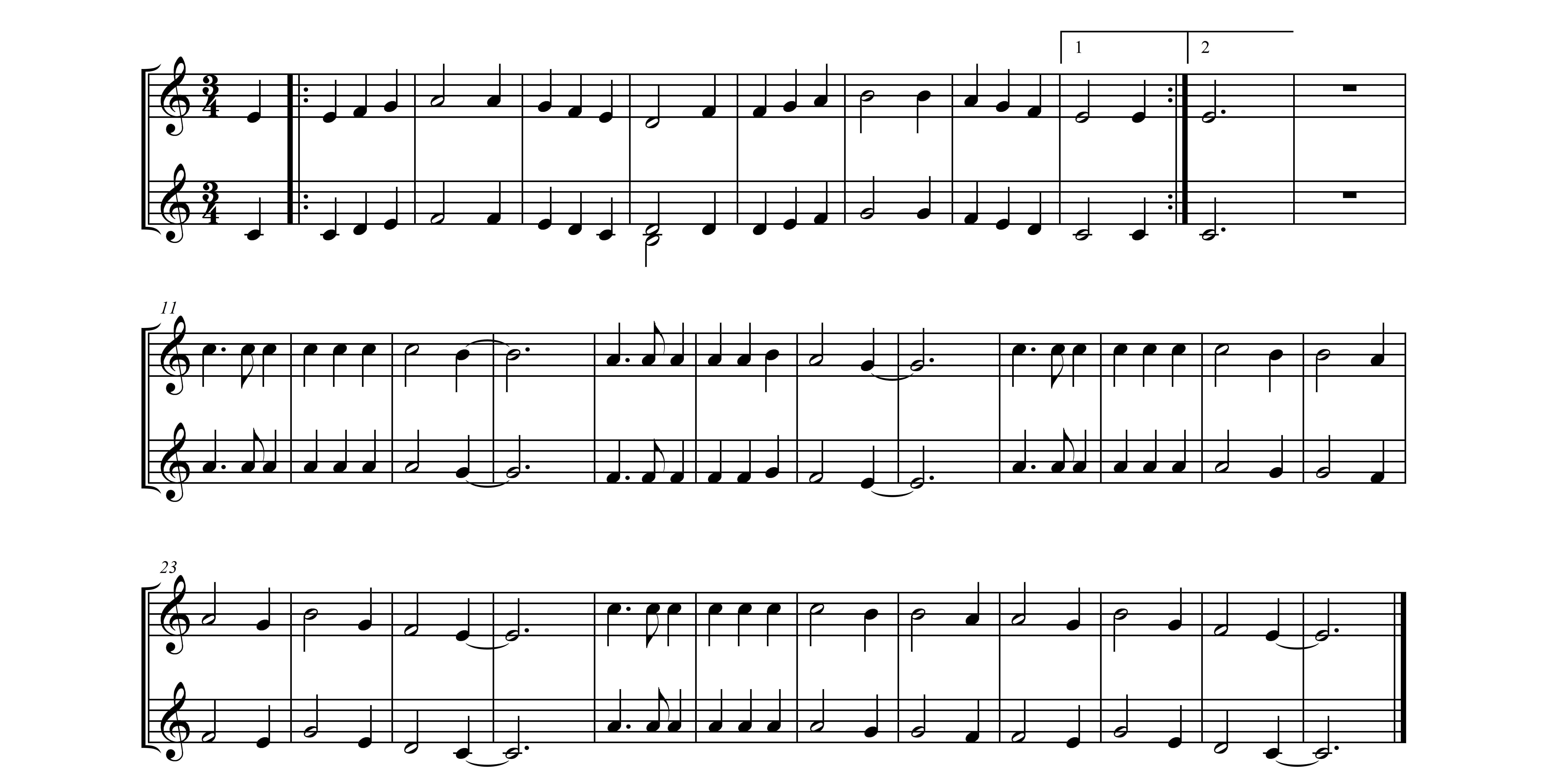 Cantar e tocar coas frautas (neste caso coa nota re na segunda frauta e cuarto compás) a peza popular de todos coñecida. Non todas as letras presentadas sonlle propias, pero si facilmente adaptables.