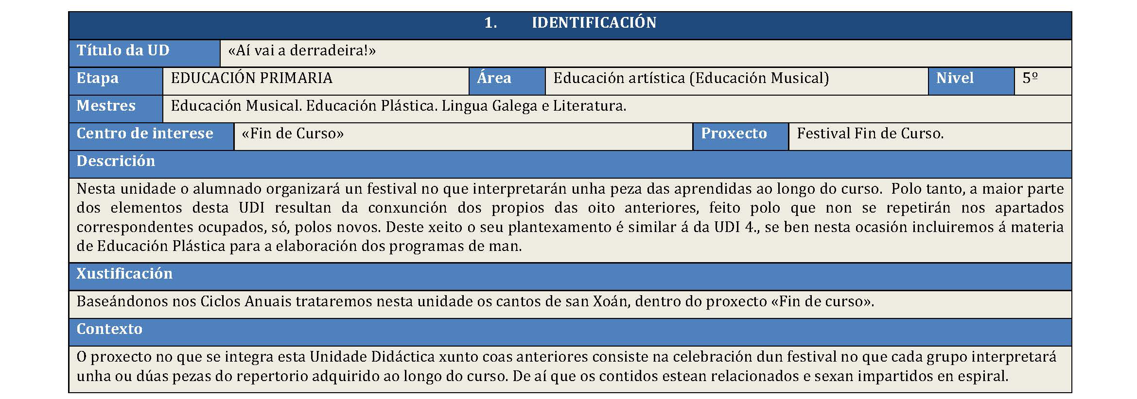 Nesta unidade falamos do san Xoán e as súas cancións, relacionadas coas tarefas agrícolas do verano. Interpretaremos unha canción con acompañamento de instrumental Orff das aprendidas ao longo do curso, no marco dun proxecto en forma de Festival Fin de Curso. En caso de que o tempo non o permita abordaremos a interpretación de «Apaga o candil» como canción de despedida, cantada (ou ben coas frautas) a dúas voces (se é posible); no caso de escollela trataremos o valse como xénero popular galego.