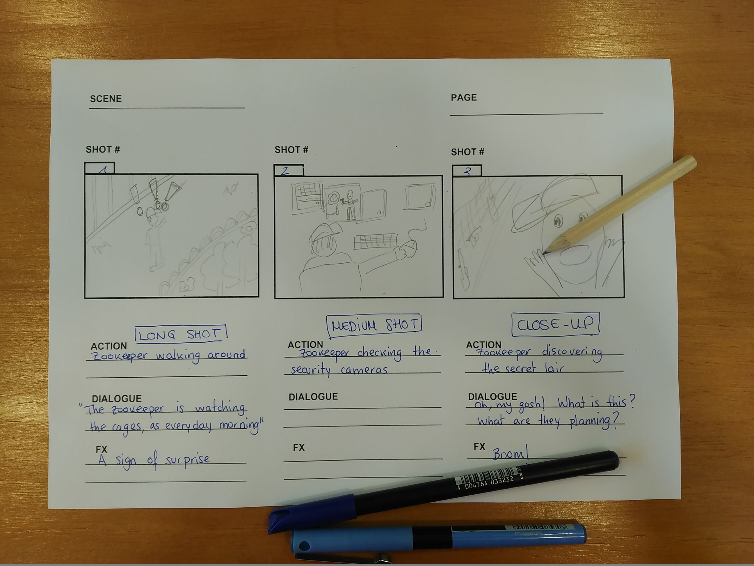 With the guide of the timeline, fill the panels with sketches of your story. Remember to use different shots depending on the scene.