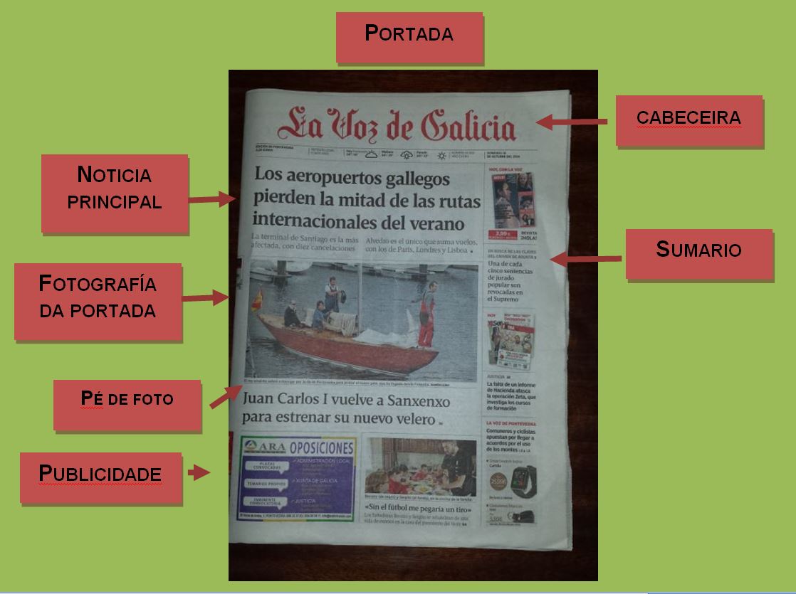 + Cabeceira: a cabeceira é a identificación do xornal. Contén o nome do periódico, a data do día en que se publica ese ejemplar, o logotipo, o lema ou frase que define o periódico, datos da empresa editora, anos que leva publicándose o periódico, o número de exemplar, o custo do mesmo.