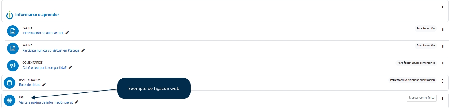 Establecer ligazóns a sitios web é un recurso moi frecuente. Nun curso virtual é doado facer estas ligazóns. Cómpre usar o recurso "Ligazón a un sitio web ou sitio web".