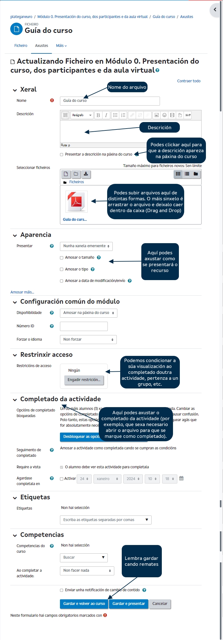 É doado almacenar todo tipo de arquivos nun curso virtual para gardalo e tamén para facilitar, entregar, transmitir... aos participantes.