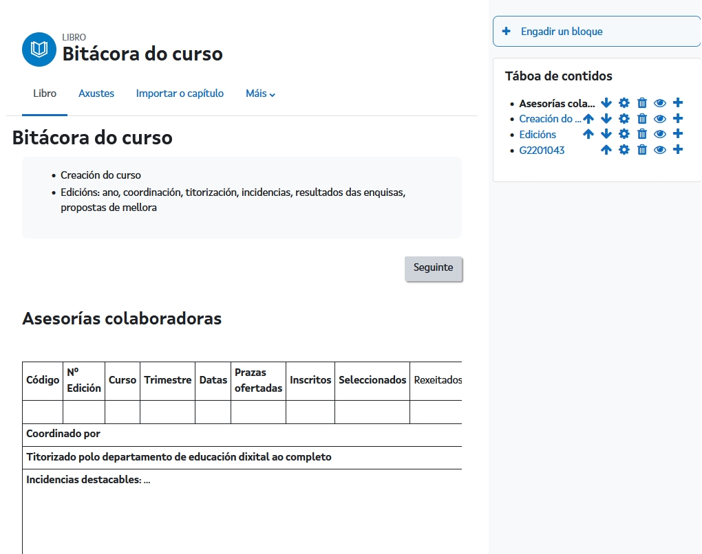 Para poder editar un libro, debemos entrar nel (NON é posible engadir ou modificar contido desde o menú de axustes). Co modo edición activo,