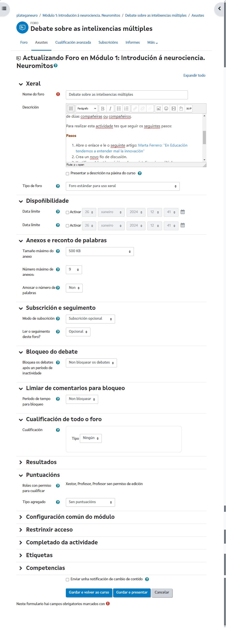 Todas estas posibilidades educativas poden quedar diluídas se simplemente creamos o foro e damos unhas cantas instrucións para que os estudantes participen. É fundamental que o foro, como calquera outra actividade, estea integrado e sirva para a consecución dos obxectivos do curso. Por outro lado, o éxito dun foro depende en boa medida do estilo de moderación e dinamización, polo que haberá que coidar especialmente este labor para garantir un avance continuo na argumentación.
