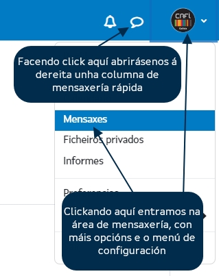 Ao pulsar sobre o nome e apelidos do usuario, pódense ver as mensaxes non lidas, as mensaxes recentes ou o historial completo de mensaxes co devandito usuario. Do mesmo xeito, podemos continuar coa conversa coma se se tratase dun chat.