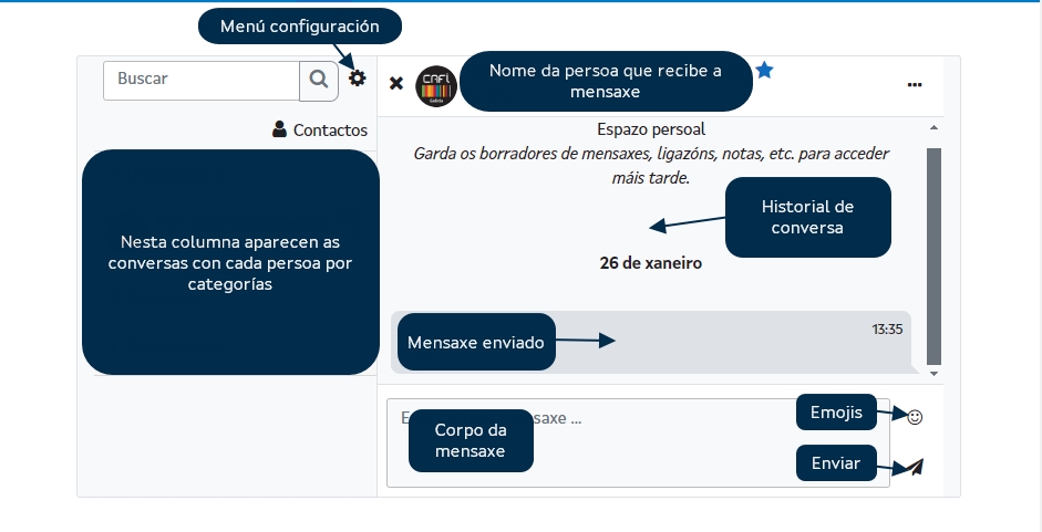 Serve para a comunicación directa cunha persoa ---participante ou titor--- sobre a progresión da aprendizaxe, a solicitude de requisitos ou xustificacións de carácter persoal quedando todo rexistrado no historial.