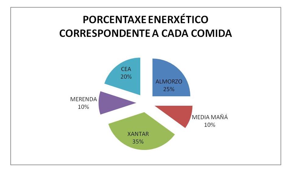 Ao longo do día recoméndase facer 5 comidas. Distribuiranse ao longo do día da seguinte maneira: 1- ALMORZO 2- MEDIA MAÑÁ 3- XANTAR 4 - MERENDA 5- CEA |