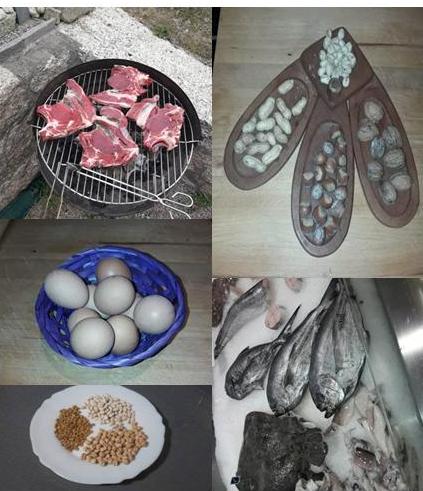 Carne, ovos, peixe, legumes e froitos secos.