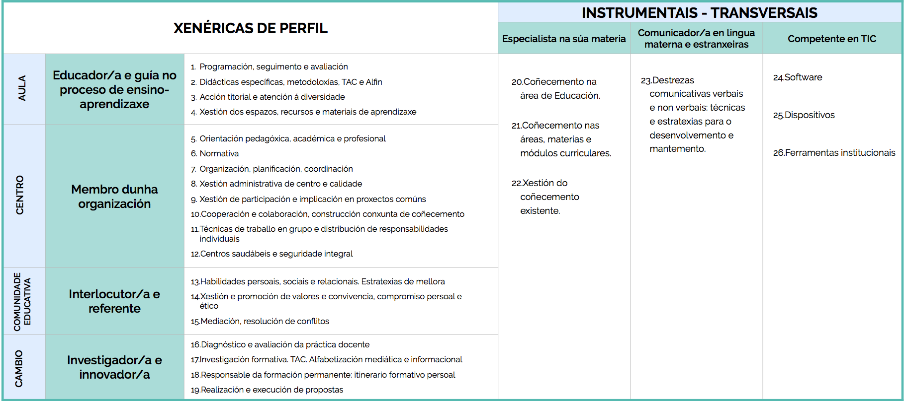 Este modelo competencial agrupa as sete competencias profesionais docentes en xenéricas e instrumentais / transversais. A súa vez cada unha delas desglósase en varias subcompetencias. Consulta o cadro resumo das Competencias profesionais docentes.