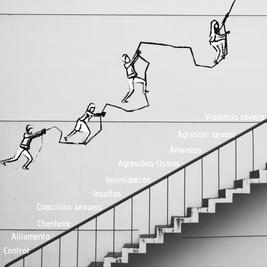 - Esta é a escaleira da violencia de xénero. En cada chanzo coloca unha escena da película que reflicta cada unha das formas da violencia.