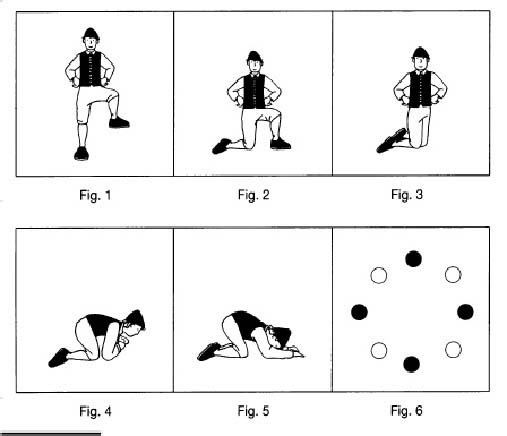 B.- Fanse figuras, sumando unha de cada vez (levantar o pé dereito, logo o esquerdo, de xeonllos sobre a dereita, sumar esquerda, codeiro dereito no chan, tamén o esquerdo, no chan coas mans apoiadas no chan diante da cabeza).