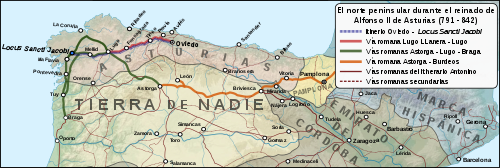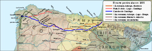 La primera ruta que siguieron los peregrinos fue la que partía de la capital de Asturias y que, a través de la montaña, llegaba a Lugo y continuaba hasta el Locus Sancti Iacobi.[18] Con la expansión de los reinos cristianos hacia el sur, quedó bajo su control la antigua ruta romana que unía Burdeos con Astorga a través de Pamplona, Burgos y León.[19] Esta fue la base sobre la que se desarrolló el trazado clásico del Camino de Santiago tras realizarse algunos cambios en su recorrido, principalmente para hacerlo pasar por zonas más pobladas.[20]