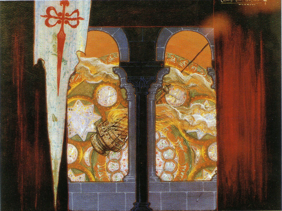 Este é o decorado creado por Camilo Díaz Baliño para que o Coro De Ruada cantara diante esta peza. As alusións a Galicia e a representación inequívoca da Catedral (triforio, botafumeiro) inundan de simboloxía a imaxe.