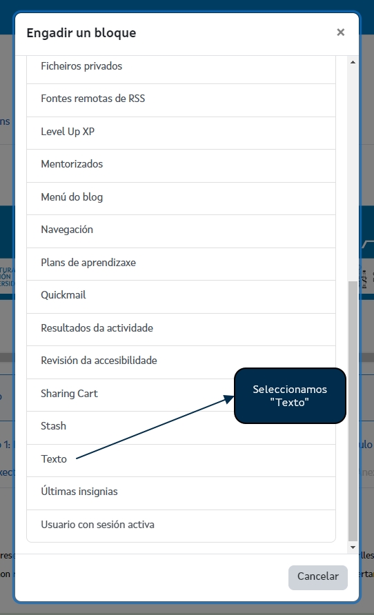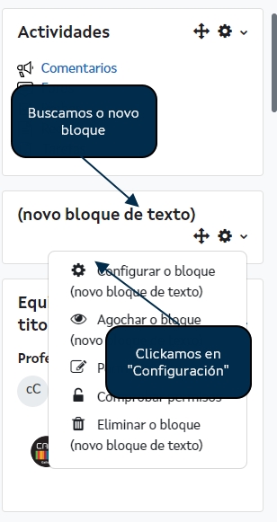 Mediante o bloque HTML podemos embeber Widgets, hiperenlaces ou información importante nun curso virtual. Para elo, crearemos e configuraremos un bloque HTML: