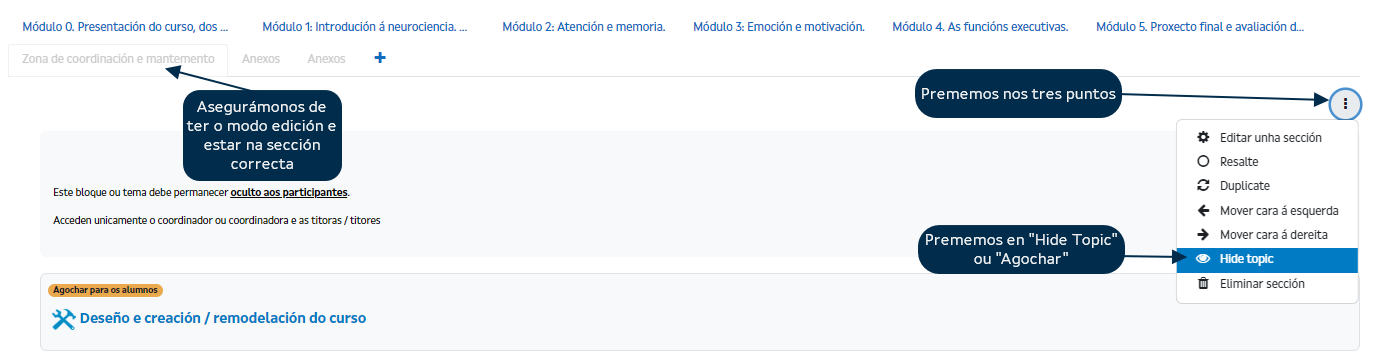 - Agochar aos alumnos cada item da zona de coordinación (na configuración estándar dos cursos Platega xa están agochados).