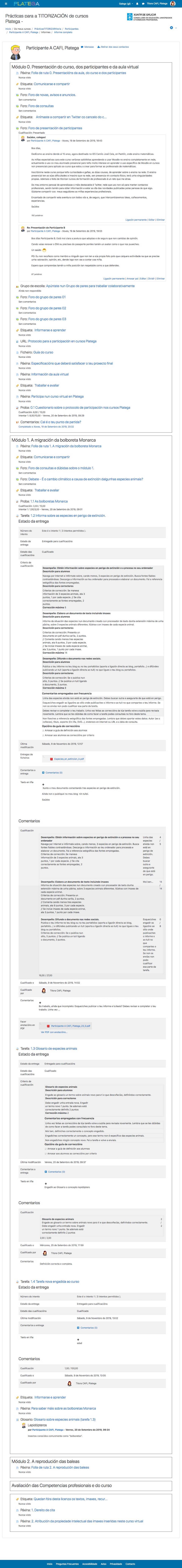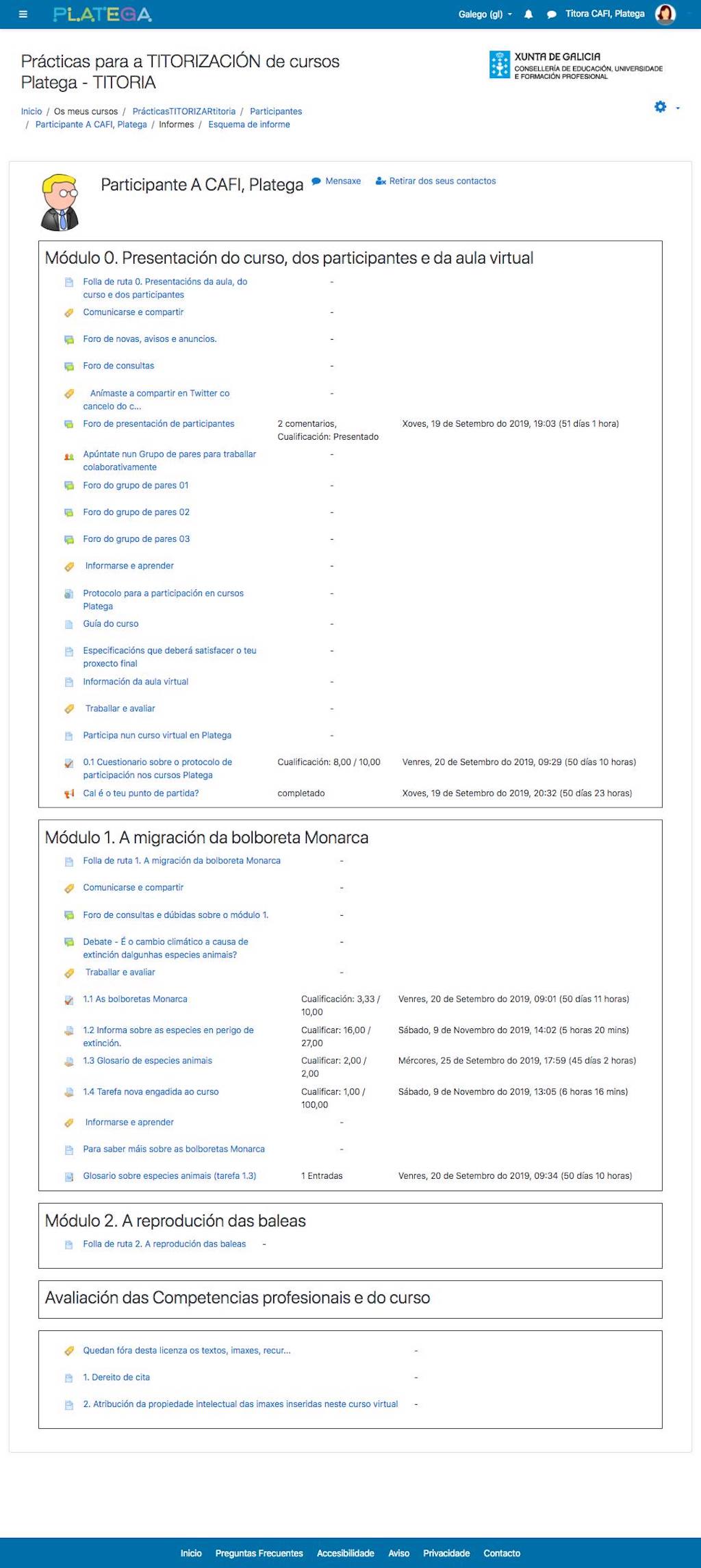 Consulta este exemplo de Informe completo para visuaizar el tipo de informes dos teus titorandos que podrás consultar ao titorizar un curso Platega.