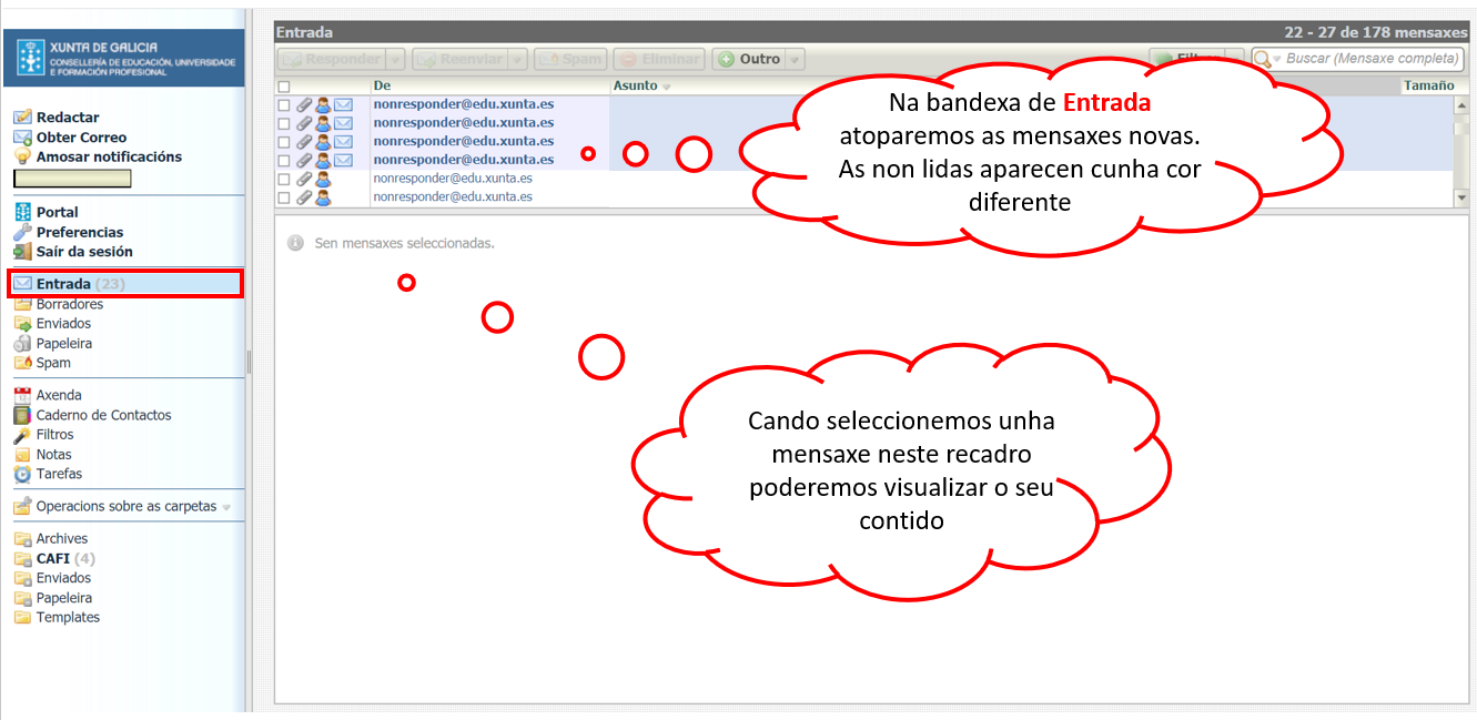 Na Bandexa de entrada poderemos atopar todas as mensaxes novas recibidas; así como visualizar, enviar, buscar e clasificar e ordenar en carpetas as mensaxes de correo electrónico que recibamos ou enviemos como usuarios.