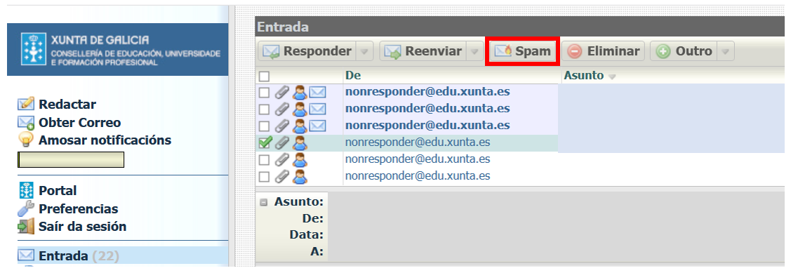 Como nos casos anteriores esta opción actívase cando hai unha mensaxe seleccionada. Unha vez feito isto, ao premer sobre o botón Spam, reportarase dita mensaxe como correo non desexado e moverase a mensaxe a carpeta Spam.